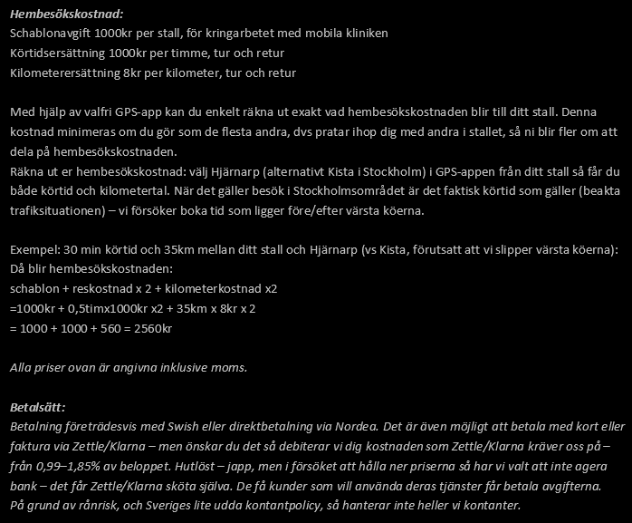 Klinikbesök Evidensia Ugglarps gård: Evidensia står här för debiteringen, så jag kan inte ge specifikt pris. Brukar hamna runt 3200 för en rutinöversyn.